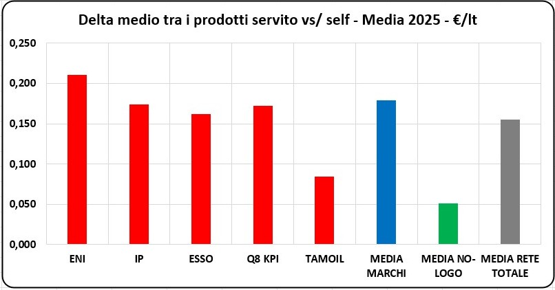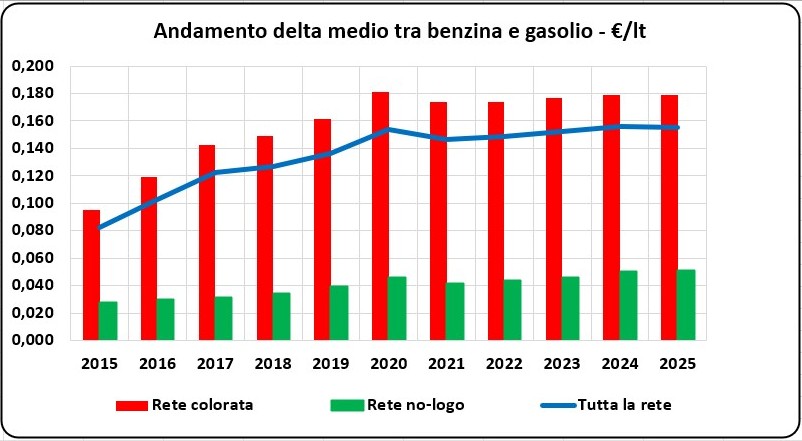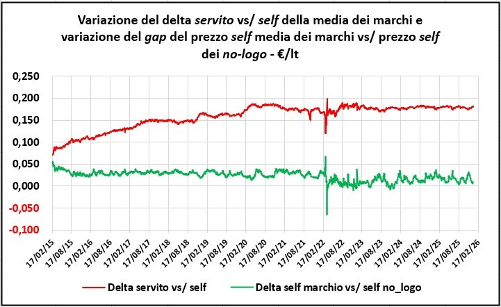 Considerando la somma di tutte le variazioni sul giorno antecedente, sia in aumento che in diminuzione, tra il 17 febbraio 2015 ed il 31 dicembre 2025, il delta prezzo tra servito e self nella media delle reti di marchio è salito di +0,110 euro/litro, il gap del prezzo self delle reti di marchio rispetto al self dei «no-logo» è sceso di -0,047 euro/litro.