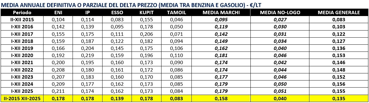 - nel dettaglio dei marchi, a dicembre 2025 AGIP ENI segnala un differenziale di 21,1 eurocent/ litro su una media dell’intero periodo febbraio 2015-dicembre 2025 di 17,8 eurocent/litro [media annua 2015 di 10,4, media annua 2016 di 14,2, media annua 2017 di 15,5, media annua 2018 di 15,9, media annua 2019 di 16,6, media annua 2020 di 19,2, media annua 2021 di 20,0, media annua 2022 di 20,8, media annua 2023 di 20,7, media annua 2024 di 20,9, media annua 2025 di 21,1]; API IP segnala un differenziale di 17,3 eurocent/litro su una media dell’intero periodo febbraio 2015-dicembre 2025 di 17,8 eurocent/litro [media annua 2015 di 10,4, media annua 2016 di 14,2, media annua 2017 di 15,5, media annua 2018 di 18,7, media annua 2019 di 20,4, media annua 2020 di 21,9, media annua 2021 di 19,5, media annua 2022 di 18,0, media annua 2023 di 18,3, media annua 2024 di 17,7, media annua 2025 di 17,4]; ESSO segnala un differenziale di 16,2 eurocent/litro su una media dell’intero periodo febbraio 2015-dicembre 2025 di 13,9 eurocent/litro [media annua 2015 di 10,4, media annua 2016 di 14,2, media annua 2017 di 15,5, media annua 2018 di 12,2, media annua 2019 di 14,5, media annua 2020 di 15,9, media annua 2021 di 16,0, media annua 2022 di 16,1, media annua 2023 di 16,0, media annua 2024 di 16,2, media annua 2025 di 16,2]; KUPIT Q8 segnala un differenziale di 17,3 eurocent/litro su una media dell’intero periodo febbraio 2015-dicembre 2025 di 17,8 eurocent/litro [media annua 2015 di 10,4, media annua 2016 di 14,2, media annua 2017 di 15,5, media annua 2018 di 18,2, media annua 2019 di 17,5, media annua 2020 di 19,7, media annua 2021 di 17,3, media annua 2022 di 17,2, media annua 2023 di 17,0, media annua 2024 di 17,3, media annua 2025 di 17,2]; TAMOIL segnala un differenziale di 8,2 eurocent/litro su una media dell’intero periodo febbraio 2015-dicembre 2025 di 8,3 eurocent/litro [media annua 2015 di 4,6, media annua 2016 di 5,0, media annua 2017 di 7,2, media annua 2018 di 9,4, media annua 2019 di 10,6, media annua 2020 di 11,0, media annua 2021 di 9,0, media annua 2022 di 8,6, media annua 2023 di 8,5, media annua 2024 di 8,5, media annua 2025 di 8,4]; l’insieme della RETE COLORATA di marchio segnala un differenziale di 17,9 eurocent/litro su una media dell’intero periodo febbraio 2015-dicembre 2025 di 15,8 eurocent/litro [media annua 2015 di 10,4, media annua 2016 di 14,2, media annua 2017 di 15,5, media annua 2018 di 14,9, media annua 2019 di 16,2, media annua 2020 di 18,1, media annua 2021 di 17,4, media annua 2022 di 17,4, media annua 2023 di 17,7, media annua 2024 di 17,9, media annua 2025 di 17,9]; l’insieme dei NO-LOGO segnala un differenziale di 5,0 eurocent/litro su una media di 4,0 eurocent/litro dell’intero periodo febbraio 2015-dicembre 2025 [media annua 2015 di 2,7, media annua 2016 di 3,0, media annua 2017 di 3,1, media annua 2018 di 3,4, media annua 2019 di 4,0, media annua 2020 di 4,6, media annua 2021 di 4,2, media annua 2022 di 4,4, media annua 2023 di 4,6, media annua 2024 di 5,0, media annua 2025 di 5,1]; infine tutto il complesso della RETE COLORATA E NO-LOGO segnala un differenziale di 15,5 eurocent/litro su una media dell’intero periodo febbraio 2015-dicembre 2025 di 13,5 eurocent/litro [media annua 2015 di 10,4, media annua 2016 di 14,2, media annua 2017 di 15,5, media annua 2018 di 12,7, media annua 2019 di 13,6, media annua 2020 di 15,3, media annua 2021 di 14,6, media annua 2022 di 14,8, media annua 2023 di 15,2, media annua 2024 di 15,6, media annua 2025 di 15,5].