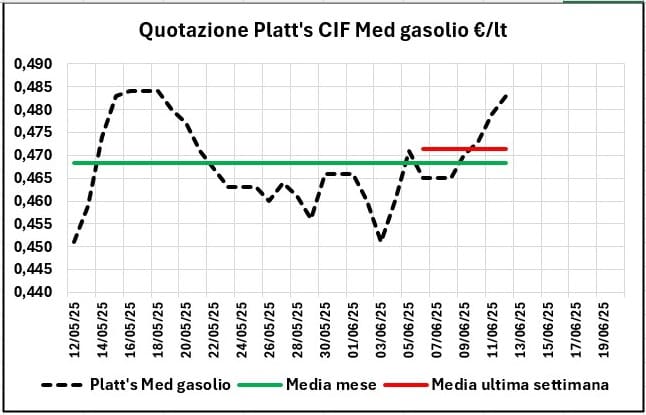 La quotazione del greggio di riferimento aumenta, dal 12/05/2025 al 12/06/2025, da 58,49 a 59,82 €/barile, con un incremento significativo di +1,33 (+2,62 %), con un tasso di cambio assai apprezzato del +4,39 % (da 1,1106 a 1,1594 dollari per un euro).