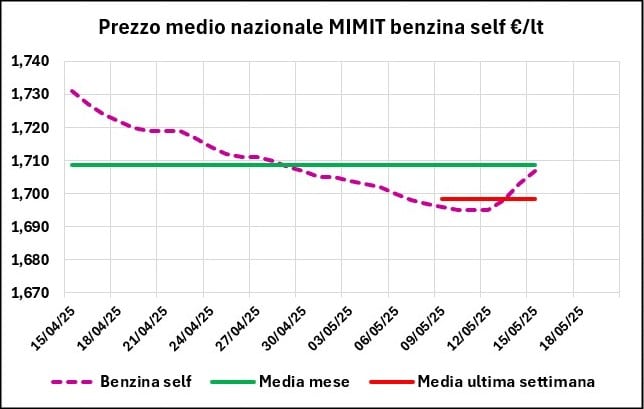 Sulla base del prezzo medio nazionale di tutta la rete, elaborato sul file “Il prezzo alle 8” del MIMIT, si osserva che dal 08/05/2025 al 15/05/2025 il prezzo della benzina è aumentato in self di +0,010 €/lt (da 1,697 a 1,707, +0,59 %) ed in servito di +0,008 (da 1,840 a 1,848, +0,43 %); quello del gasolio è salito in self di +0,001 €/lt (da 1,589 a 1,590, +0,06 %) ed in servito è diminuito di -0,001 (da 1,732 a 1,733, -0,06 %).