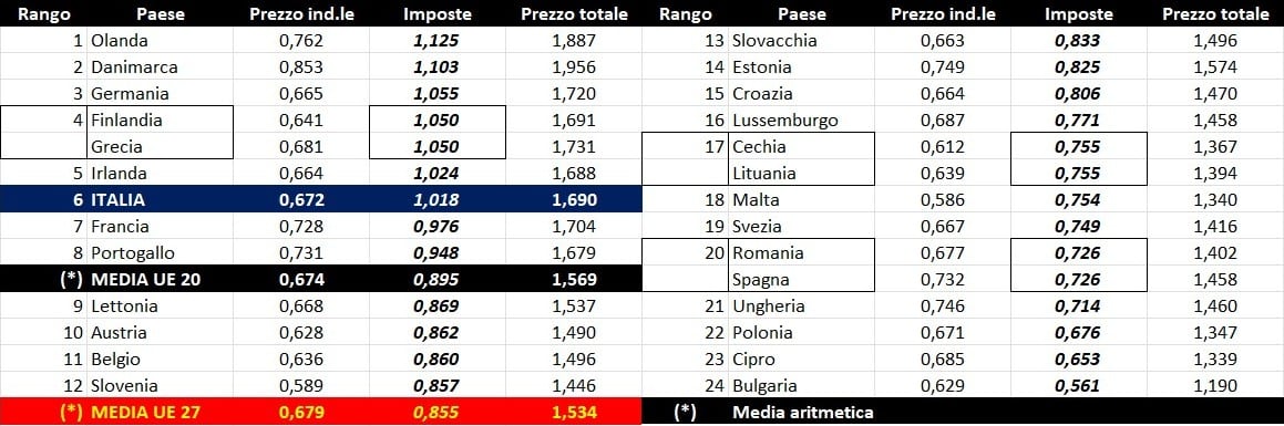 Per quanto attiene la rilevanza delle imposte sui carburanti, l’Italia si colloca al 09.06.2025 al sesto posto per il prodotto benzina, con 1,018 euro/litro su totali 1,690 di prezzo al pubblico (contro la media di 0,855 a 27 Paesi e di 0,895 a 20 Paesi area euro), nonché al secondo posto per il gasolio con 0,919 euro/litro su 1,586 di prezzo al consumo (contro la media di 0,740 a 27 Paesi e di 0,765 a 20 Paesi area euro).