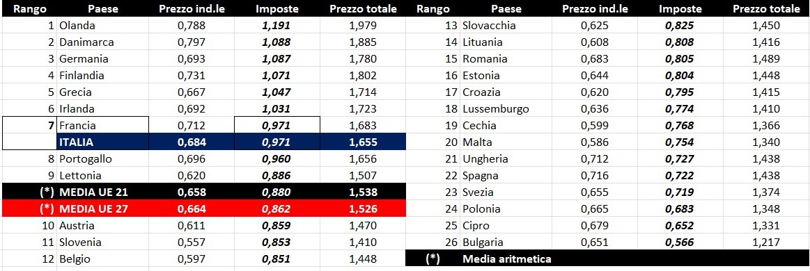 Sulla rilevazione comunitaria si osserva che dieci Paesi su 27 hanno apportato dal 1° gennaio 2026 variazioni di accisa (tra cui l’Italia che ha parificato l’accisa tra benzina e gasolio, diminuendo di 0,049 €/lt – IVA compresa – quella sulla benzina ed aumentando dello stesso importo quella sul gasolio) e che i metodi di rilevazione del prezzo sono difformi tra i vari Paesi (tra cui alcuni calcolano la media settimanale, altri il prezzo del lunedì, altri quello del venerdì o della domenica, o la media degli ultimi tre o quattro giorni), il che genera non solo una omogeneità discutibile delle medie dei prezzi riferibili all’area valutaria Euro – peraltro salita da 20 Paesi e 21 con l’introduzione dell’euro in Bulgaria -, sia alle medie del complesso dei 27 Paesi, ma, soprattutto, del calcolo tra imposte e prezzi industriale). A questi fattori si aggiunga che il metodo di calcolo ponderale (media calcolata non sul prezzo in sé, ma sul quantitativo di consumi) può essere o meno stato aggiornati sui dati più recenti. In particolare, il prezzo comunicato alla Commissione dall’Italia (che dovrebbe essere la media settimanale dal lunedì precedente alla domenica) è stato caricato con le nuove accise, che in realtà hanno avuto efficacia per quattro giorni su sette (la media esatta è di 0,69026 €/lt per la benzina e di 0,65554 per il gasolio, diversa dall’importo di 0,67290 che è entrato in vigore solo dal quarto giorno della settimana). Le risultanze ufficiali, pertanto, in materia di medie di imposte e prezzo industriali sono da considerarsi con scetticismo.