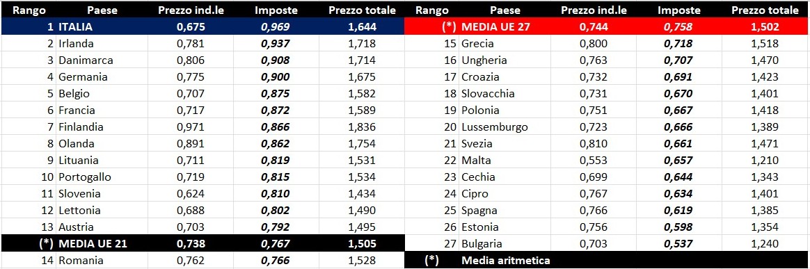 Per quanto attiene la rilevanza delle imposte sui carburanti, l’Italia si colloca al 05.01.2026 al settimo posto (con la Francia) per il prodotto benzina, con 0,971 euro/litro su totali 1,655 di prezzo al pubblico (contro la media di 0,862 a 27 Paesi e di 0,880 a 21 Paesi area euro), nonché al primo posto per il gasolio con 0,969 euro/litro su 1,644 di prezzo al consumo (contro la media di 0,758 a 27 Paesi e di 0,767 a 21 Paesi area euro).