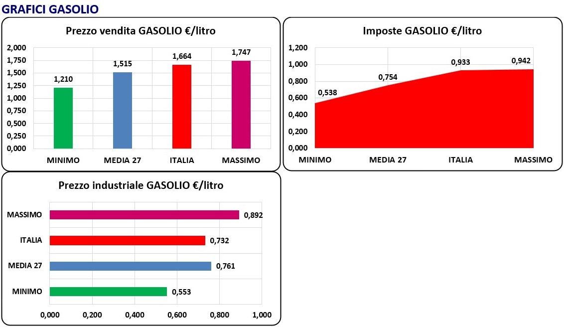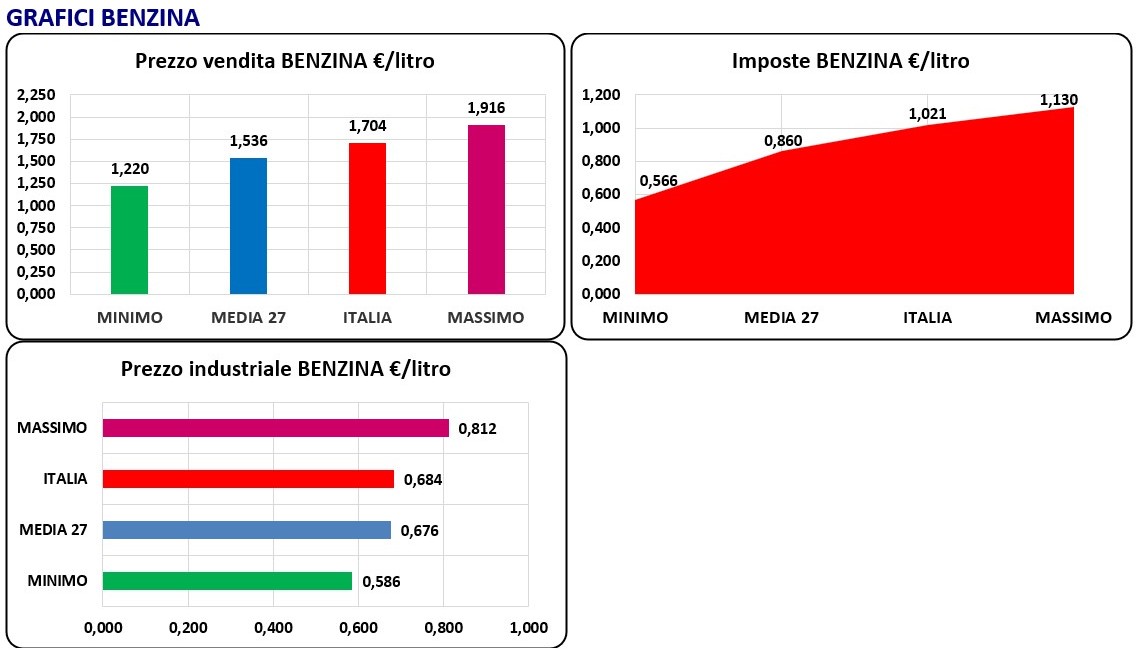 La statistica offre anche la scomposizione dei prezzi in relazione alle imposte [anche con il confronto con lo stesso mese dell’anno precedente], al prezzo industriale, nonché la determinazione dello «stacco Italia» del prezzo al consumo, delle imposte e del prezzo industriale.