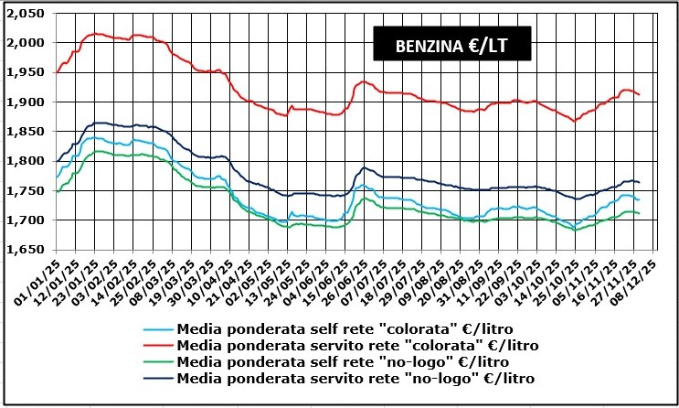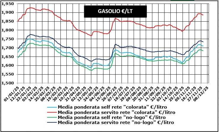 I prezzi medi di benzina, gasolio in Italia nella rete di marchio ed in quella no-logo, sia nella media che nel dettaglio delle singole modalità di servizio, il prezzo di benzina, gasolio, gpl, metano e gnl nella rilevazione settimanale del MASE, quello di benzina e gasolio nel circuito extrarete ed i fondamentali di mercato internazionali del mese (quotazione Brent e prodotti finiti Mediterraneo, cambio euro/dollaro).