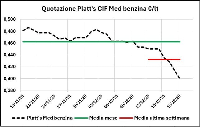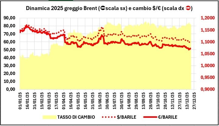 La quotazione del greggio di riferimento è diminuita dal 18/11/2025 al 18/12/2025, da 55,99 a 51,05 €/barile, con un decremento di -4,94 (-8,82 %), con un tasso di cambio apprezzato del +1,11 % (da 1,1590 a 1,1719 dollari per un euro).