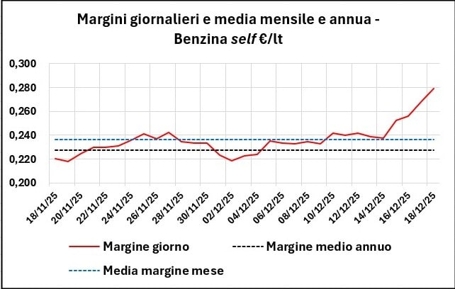 I prezzi del 18/12/2025 sono ancora inferiori alla media del periodo 01/01/2025-18/12/2025 per la benzina, dei seguenti valori: benzina self -0,040 €/lt, benzina servito -0,039 e per il gasolio: self -0,017, gasolio servito -0,016.