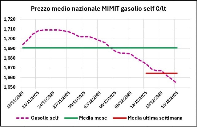 Sulla base del prezzo medio nazionale di tutta la rete, elaborato sul file “Il prezzo alle 8” del MIMIT, si osserva che dal 11/12/2025 al 18/12/2025 il prezzo della benzina è calato in self di -0,017 €/lt (da 1,716 a 1,699, -0,99 %) e in servito di -0,016 (da 1,856 a 1,840, -0,86 %); quello del gasolio è sceso in self di -0,023 €/lt (da 1,677 a 1,654, -1,37 %) e anche in servito di -0,022 (da 1,816 a 1,794, -1,21 %).