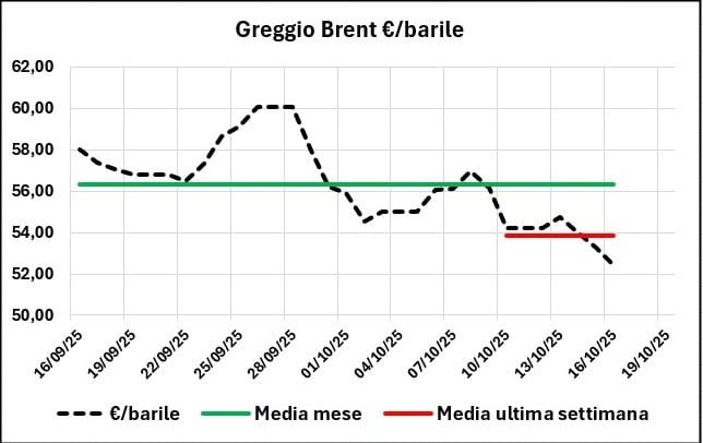 La quotazione del greggio di riferimento è diminuita dal 09/10/2025 al 16/10/2025, da 56,17 a 52,42 €/barile, ossia di -3,75 (-6,68 %), con un tasso di cambio in apprezzamento con variazione del +0,33 % (da 1,1611 a 1,1649 dollari per un euro).