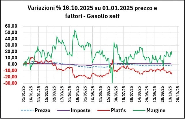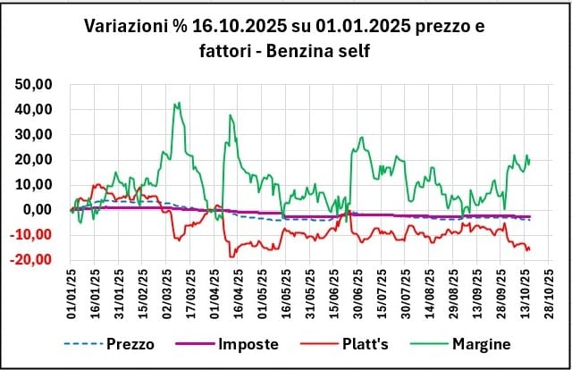 I valori al 16/10/2025 dei fondamentali di mercato sono in ogni caso ancora inferiori alla media annua del 2025 per il greggio Brent (52,42 €/barile contro una media di 62,32), e sono inferiori sia per il raffinato benzina (0,433 €/lt contro una media di 0,483) che per il raffinato gasolio (0,480 contro 0,521), con un tasso di cambio ben superiore: 1,1649 dollari per un euro contro una media di 1,1212.