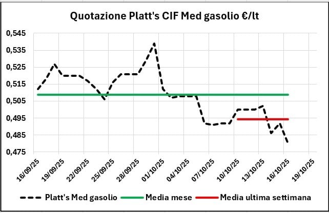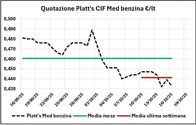 Nell’arco di una settimana, dal 09/10/2025 al 16/10/2025 la quotazione Platt’s CIF Med dei prodotti ha registrato una variazione di -0,013 con IVA per la benzina e un calo di -0,015 per il gasolio, mentre i prezzi sono scesi di -0,008 €/lt per la benzina e per il gasolio di -0,008, per ambedue i prodotti per entrambe le modalità di vendita.