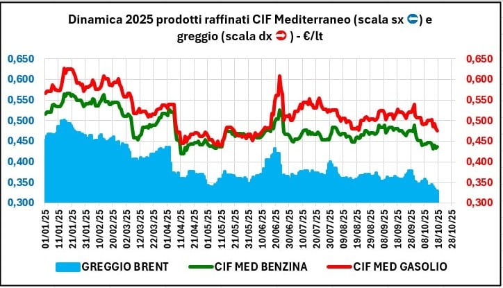 La quotazione del greggio di riferimento è diminuita dal 16/09/2025 al 16/10/2025, da 57,99 a 52,42 €/barile, con un decremento di -5,57 (-9,61 %), con un tasso di cambio deprezzato del -1,34 % (da 1,1807 a 1,1649 dollari per un euro).