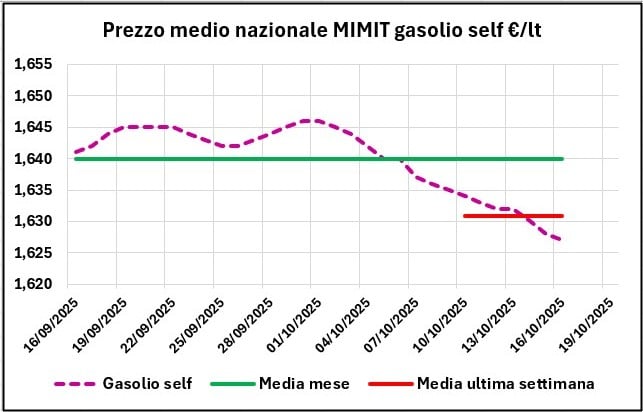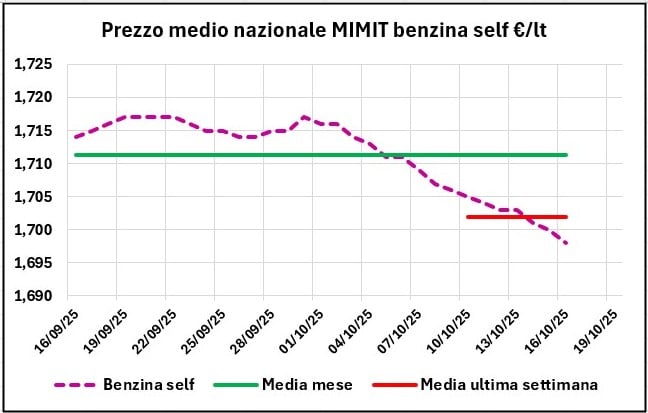 Sulla base del prezzo medio nazionale di tutta la rete, elaborato sul file “Il prezzo alle 8” del MIMIT, si osserva che dal 09/10/2025 al 16/10/2025 il prezzo della benzina è diminuito in self di -0,008 €/lt (da 1,706 a 1,698, -0,47 %) e in servito di -0,008 (da 1,847 a 1,839, -0,43 %); quello del gasolio è sceso in self di -0,008 €/lt (da 1,635 a 1,627, -0,49 %) ed in servito di -0,008 (da 1,775 a 1,767, -0,45 %).