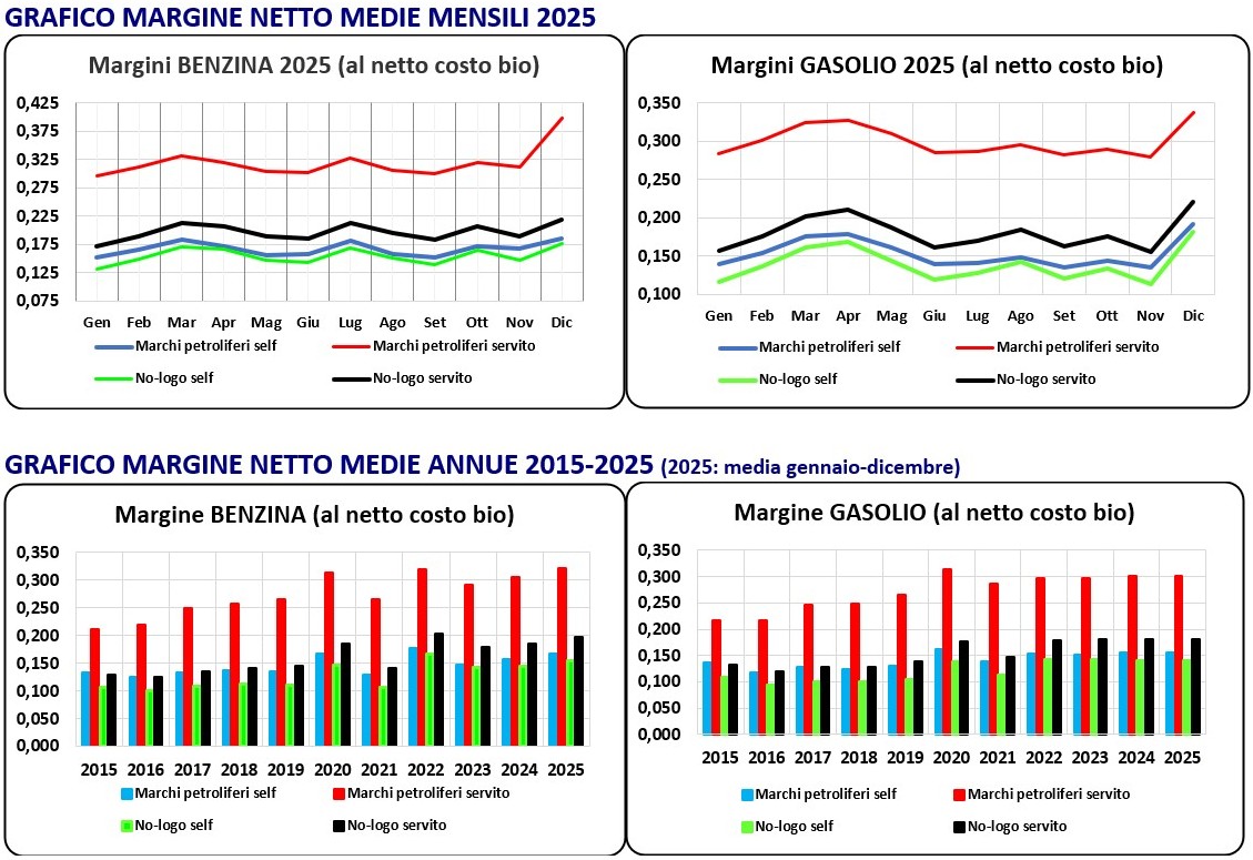 Le medie annue dal 2015 al 2025 dei margini, al netto del costo di miscelazione del biocarburante, sono le seguenti: